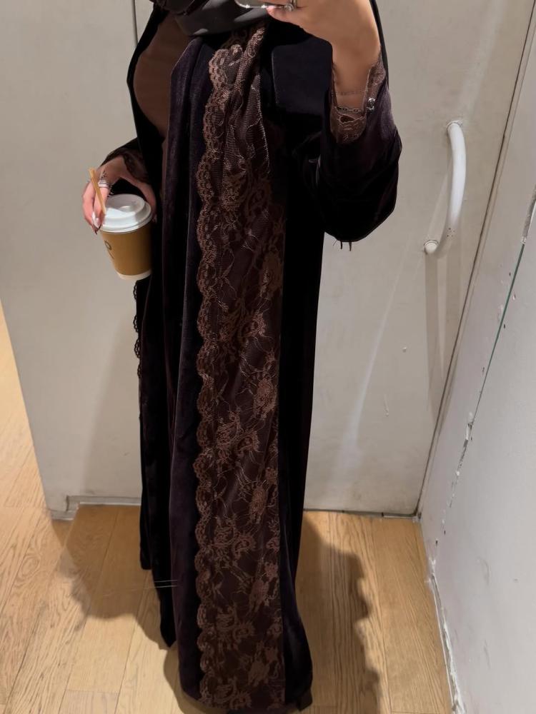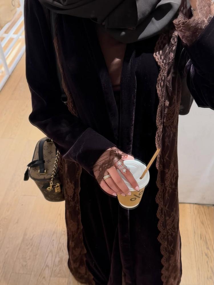 عباية مخمل بدانتيل بني-عبايات نوره