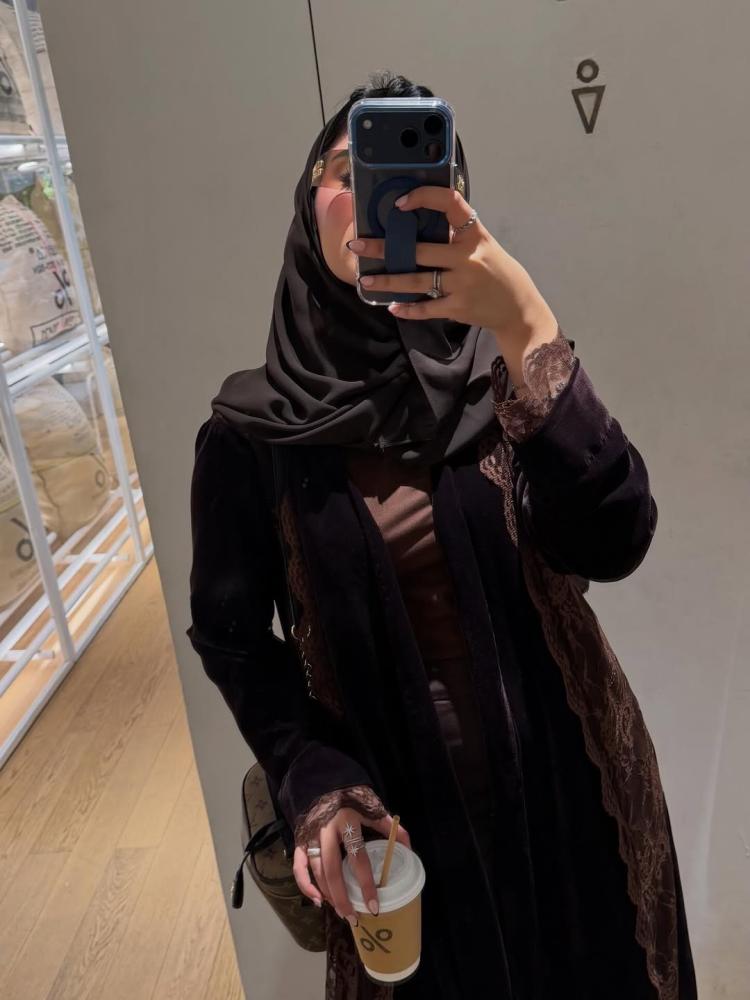 عباية مخمل بدانتيل بني🤎🦌 قصتها بليزر سيدا باكمام دانتيل والاجناب دانتيل مبطنه+كتافيه