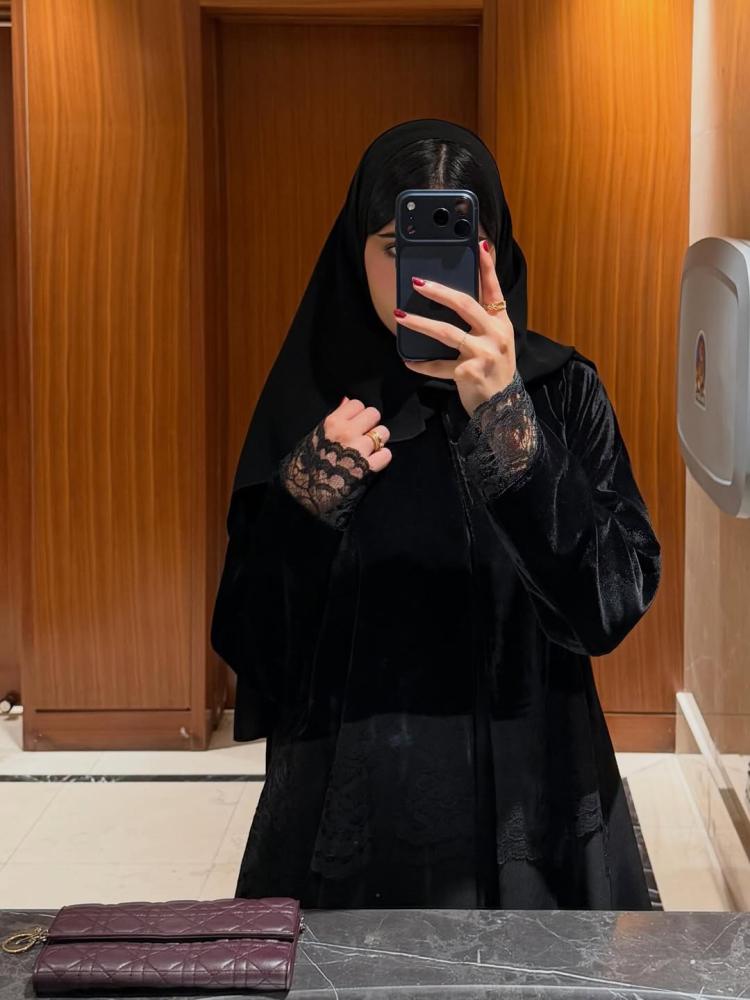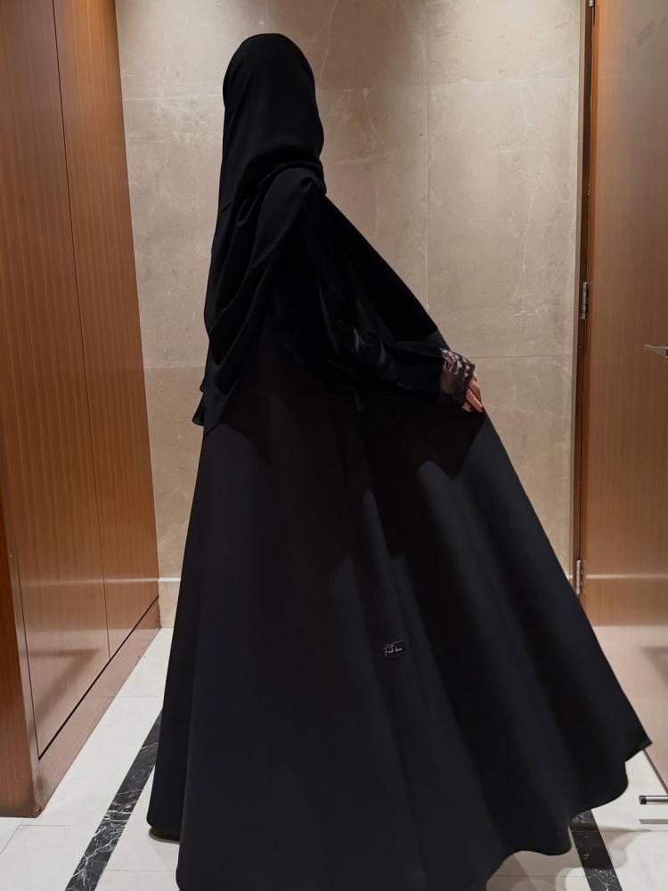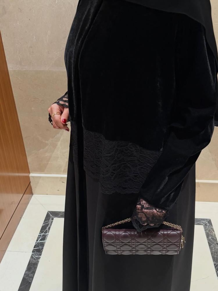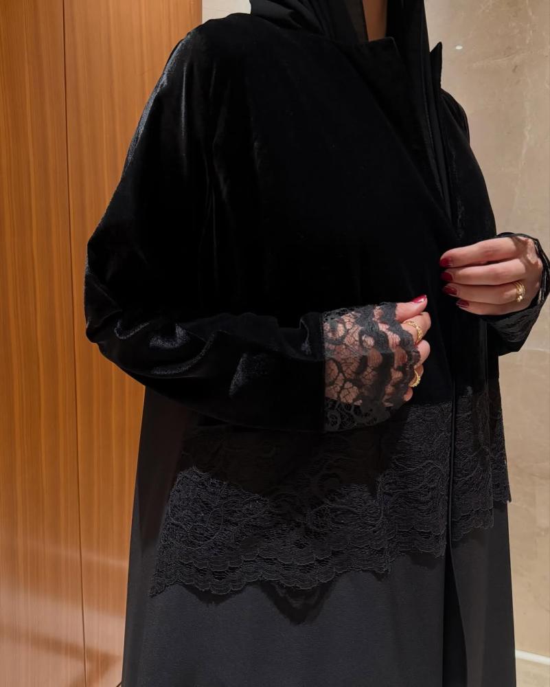 القماش مخمل اسود من نصف العباية من الامام مع كريب واقف فاصل بينهم دانتيل فرنسي اسود وطرف الكم دانتيل ، طرحة اسود سادة.